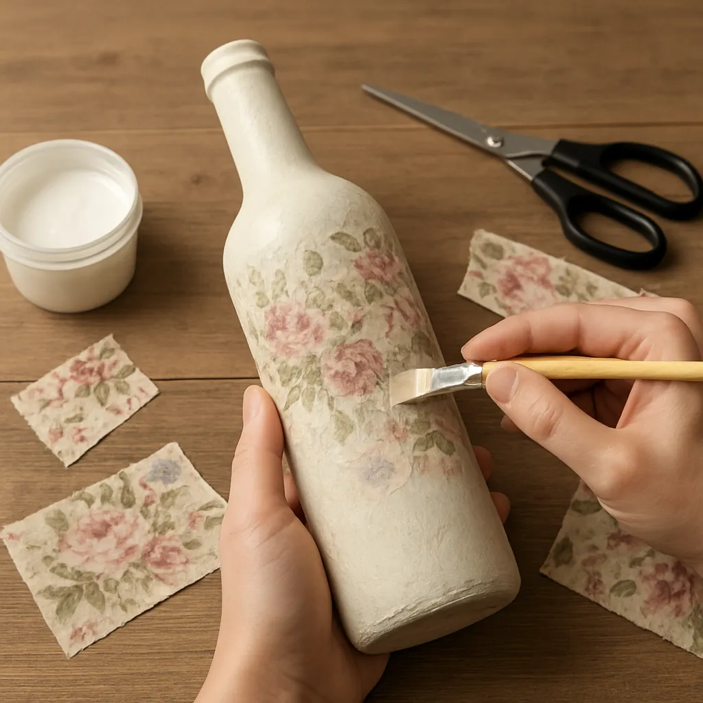 Zanim przystąpisz do przyklejania, warto delikatnie wyciąć motywy, które będą idealnie pasowały do kształtu butelki. Kreatywność przy doborze fragmentów serwetki pozwala na niezwykle oryginalne kompozycje. Ułóż wycięte elementy na powierzchni i sprawdź, jak komponują się ze sobą oraz z wybranym tłem.