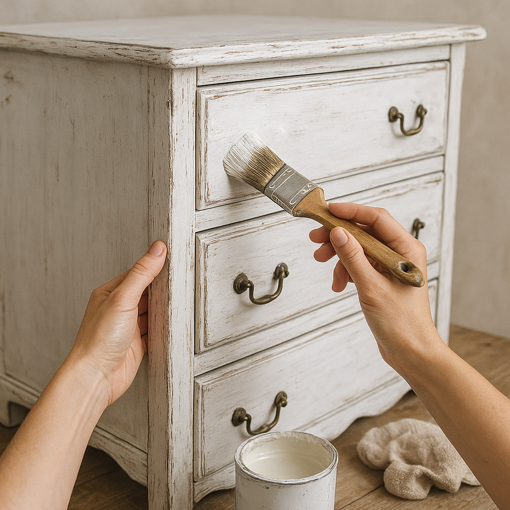 Ważną rolę odgrywa wykończenie. Wosk zabezpieczy warstwy farby, nadając subtelny połysk, a jednocześnie pozwoli na łatwą korektę przecierek w przyszłości. Jeśli wolisz większą trwałość, wybierz matowy lakier wodny – dobrze chroni przed zarysowaniami i wilgocią, ale nie odejmuje uroku postarzonej fakturze.